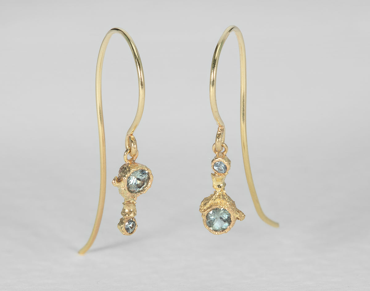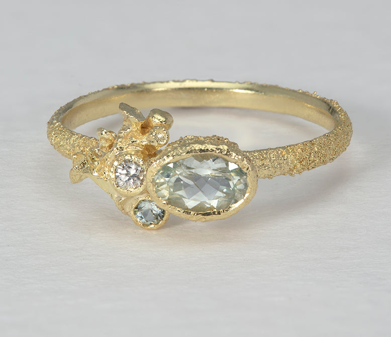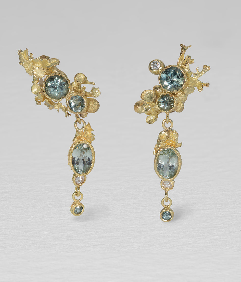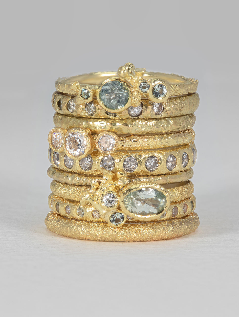 Rich layers of 18ct gold texture & my signature 'gold-dust' detail, the Lichen Collection features misty grey, greeny-blue & deep teal sapphires that evoke the calming, subtle palette of the lichens I find on Ashdown Forest