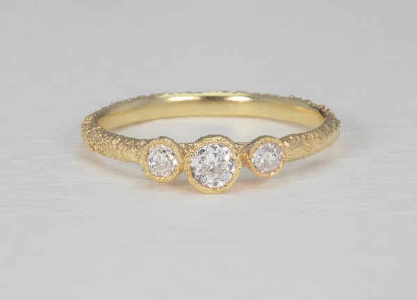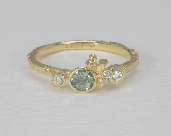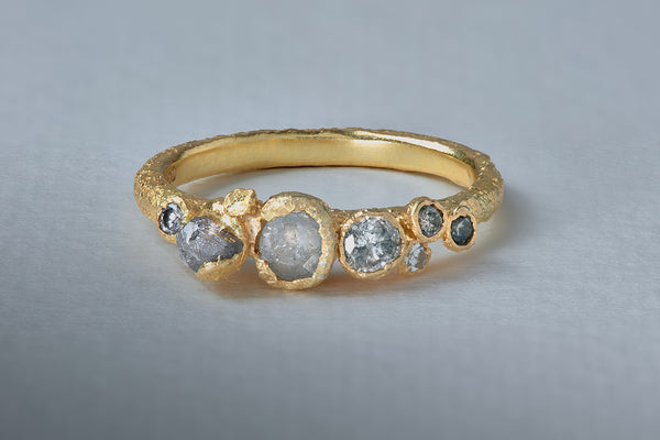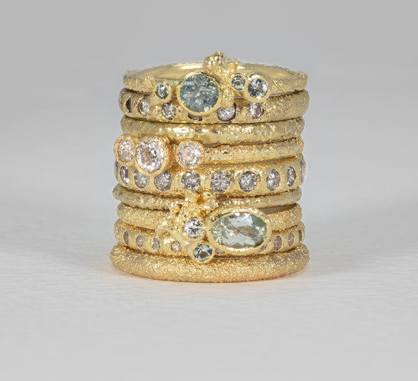 Select from a beautiful range of sapphire, diamond & gold designs to create an individual ring stack of beauty, with signature gold-dust texture & lichen details. Choose from plain gold bands, diamond eternity rings, misty grey & deep teal sapphires to create your own one-of-a-kind collection
