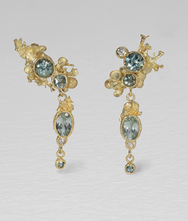 An oak branch covered with lichen catches my eye, knocked down from the trees on a wild, stormy night. Dramatic, asymmetric earrings with a subtle selection of greeny-blue sapphires and old-cut diamonds. The gold lichen forms are designed to grow along each earlobe, falling in a delicate oval drop